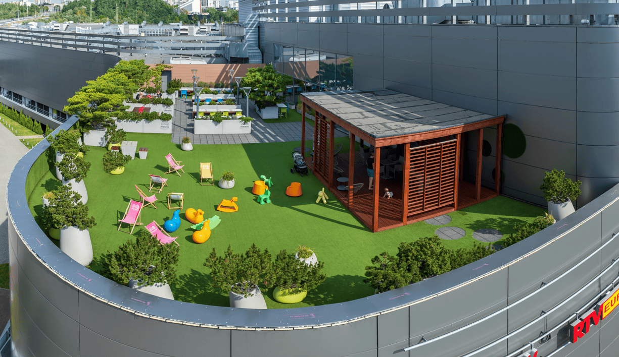 Restauracje na dachu z przyjemnym widokiem sprawiają, że każdy znajdzie coś dla siebie – nawet w czasie gorszej pogody. Część tarasu została zadaszona, właśnie po to, by uniknąć nieprzyjemności związanych z deszczem lub wiatrem. Gdy tylko na niebie pojawi się słońce, klienci mogą wybierać spośród ławek, ław, krzeseł, leżaków oraz siedzeń dla dzieci – i spędzić czas wolny tak, jak preferują.